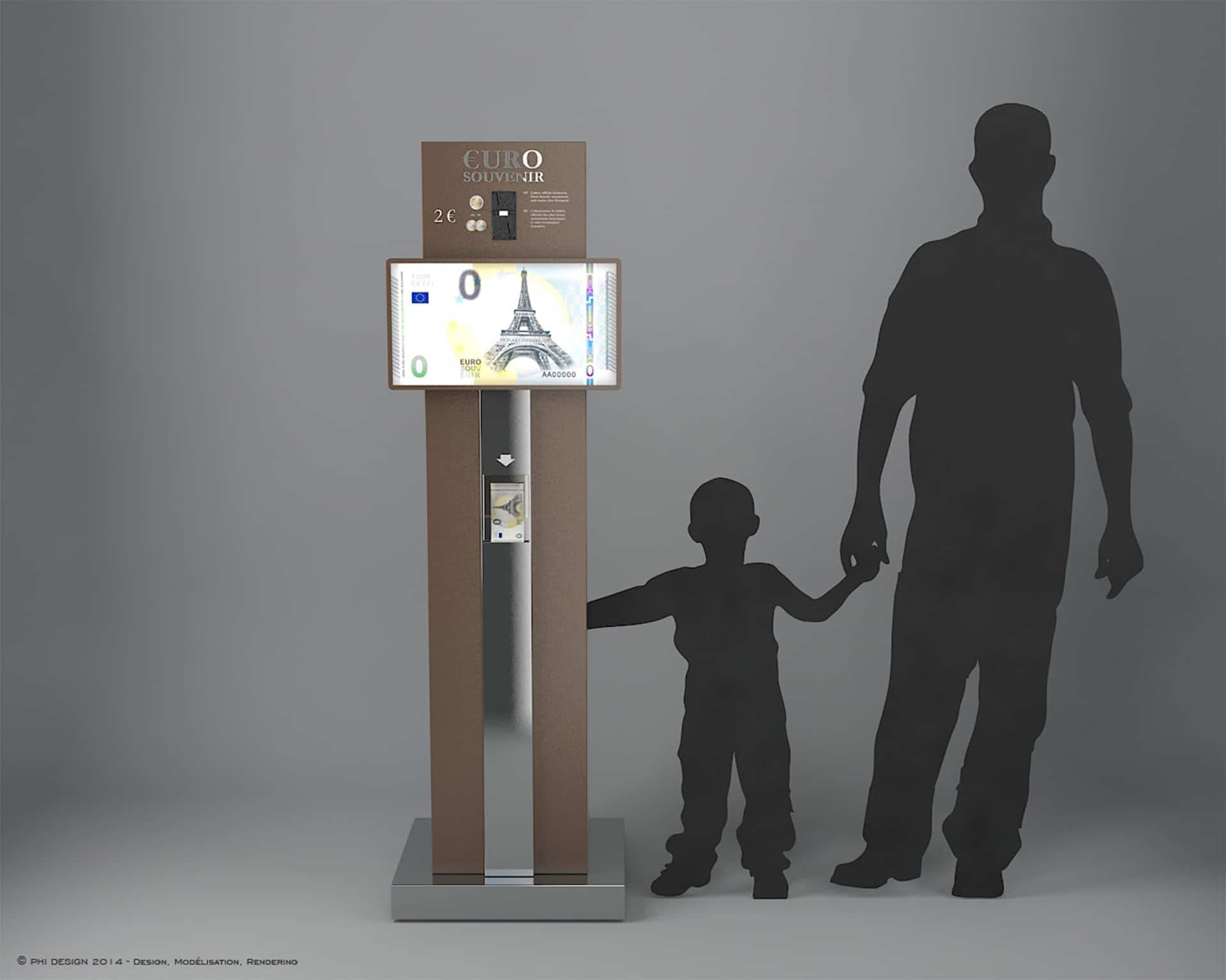 Les billets souvenirs édités par la banque de France ont besoin d’un écrin valorisant. Les sites touristiques où ils sont vendus étant variés et souvent prestigieux, le design du distributeur devait suggérer richesse et sobriété.